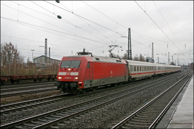 101 001 fährt mit dem InterCity 2156, von Erfurt Hbf nach Düsseldorf, am Haltepunkt Bochum-Ehrenfeld durch das Ruhrgebiet dem Ziel entgegen.