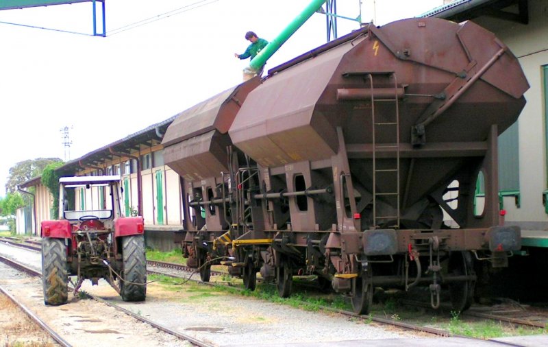 2 Tds werden mit Getreide beladen, ein Traktor(STEYR) dient zum verschieben dieser Wagen; Schwadorf 060808