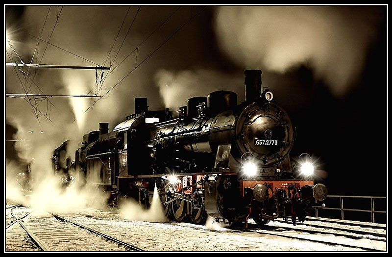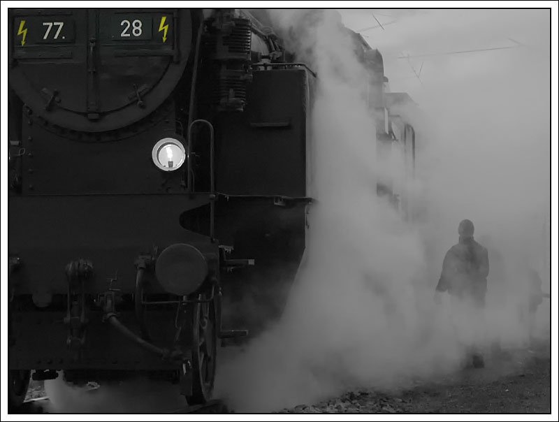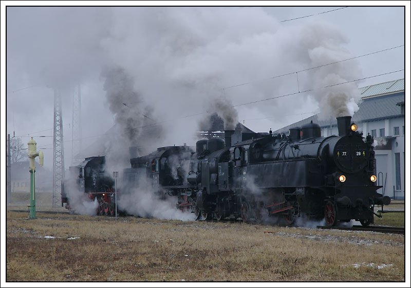 5.1.2008 – Winterdampf im Hausruck: 77.28, 638.1301 und 657.2770 der ÖGEG (Österreichische Gesellschaft für Eisenbahngeschichte) warten in Attnang-Puchheim auf die Übernahme des IGE Sonderzuges D 16111 aus Hersbruck.