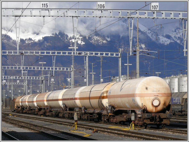 1016 023-2 KyotoExpress rangiert in Buchs SG bei einer ausgesprochenen Föhnstimmung über dem Fürstentum Lichtenstein. (07.01.2008)