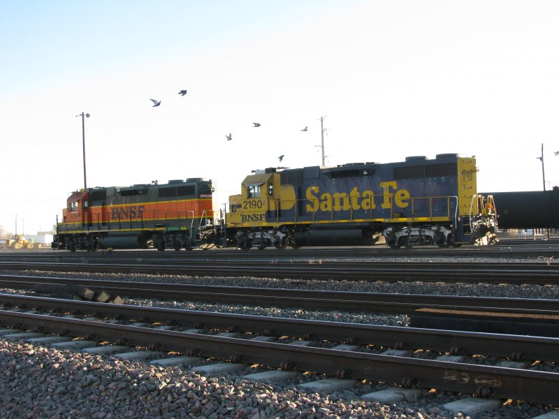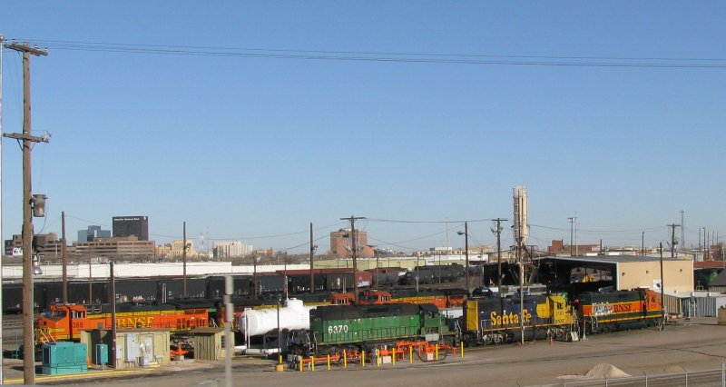 Mehrere BNSF Loks stehen vor einem Lokschuppen in einem BW der BNSF. Aufgenommen am 3.1.2008 in Amarillo (Texas).