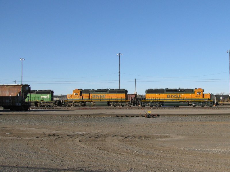 Blick auf einem Rangierbahnhof in Amarillo (Texas): Links steht ein sehr langer Güterzug, rechts im Hintergrund ist ein BNSF Zug zu sehen. Aufgenommen am 3.1.2008.