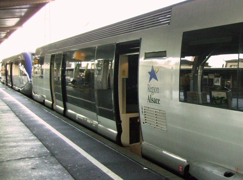 Dieser Zug der "Région Alsace" verkehrt etwa im Stundentakt zwischen Offenburg/Baden und Strasbourg/Elsass gemeinsam mit ähnlichen deutschen Zuggarnituren. Die Aufnahme entstand am 7. 1. 2008 im Bahnhof Strasbourg