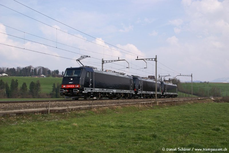 E 484 103, 105 "Lennaert" und 104 am 30.03.07 bei der Überführung von Bellinzona nach Basel Bad., hier in Oberrüti