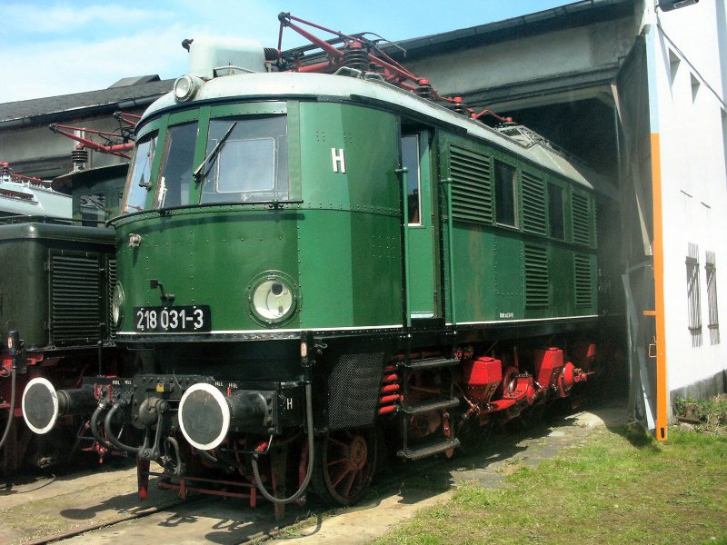 E-Lok 218 der Deutschen Reichsbahn, hier am Lokschuppen des ehem. Bw Weimar im Mai 2003