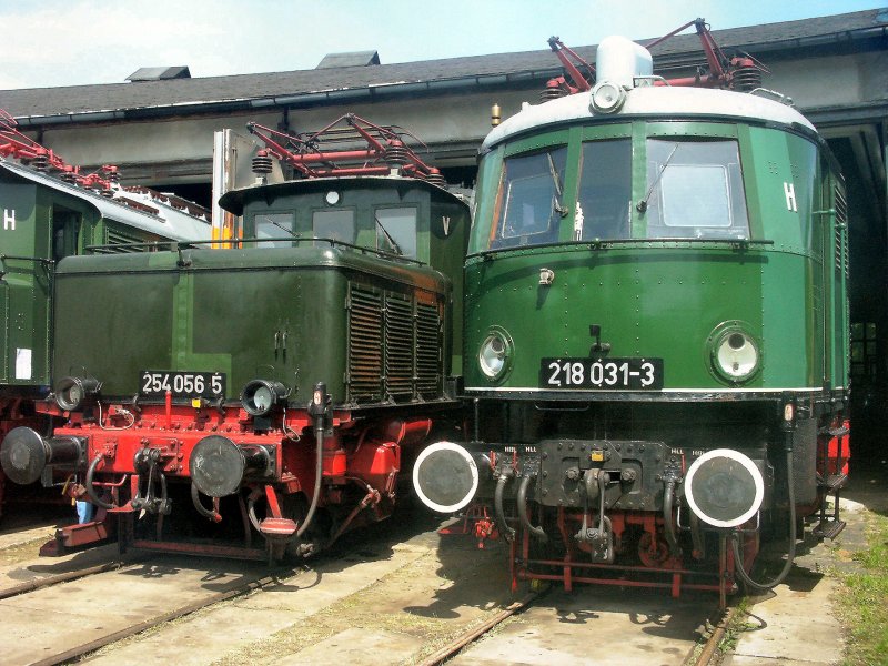 E-Loks 218 031-3 und 254 056-5 am Lokschuppen des ehem. Bw Weimar im Mai 2003