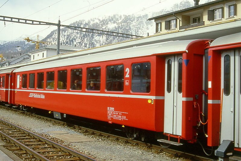 RhB - B 2292 am 15.03.2000 in Samedan - 2.Klasse Umbaupersonenwagen - Übernahme 27.12.1965 - FFA/SIG/RhB - Fahrzeuggewicht 20,00t - Sitzplätze 60 - LüP 18,42m - zulässige Geschwindigkeit 100 km/h - ®3=17.09.1999 - Logo RhB in deutsch - Kennzeichnung an den Ecken blau - Lebenslauf: ex AB4ü 1529 - 1964 AB 1529 - 05/1999 ausr - 17.09.1999 B 2292