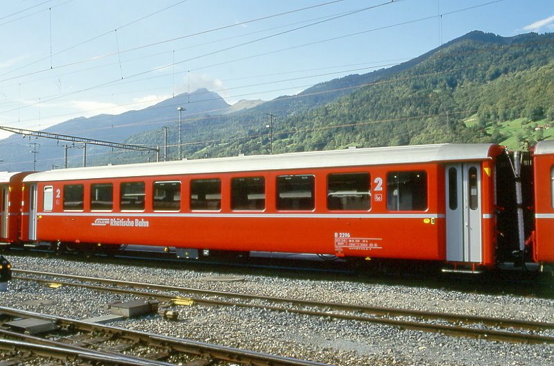 RhB - B 2296 am 02.10.1999 in Landquart - 2.Klasse Umbaupersonenwagen - Übernahme 24.01.1966 - FFA/SIG/RhB - Fahrzeuggewicht 20,00t - Sitzplätze 60 - LüP 18,42m - zulässige Geschwindigkeit 100 km/h - ®3=26.02.1999 - Logo RhB in deutsch - Kennzeichnung an den Ecken noch gelb - Lebenslauf: ex AB4ü 1533 - 1964 AB 1533 - 11/1998 ausr - 26.02.1999 B 2296