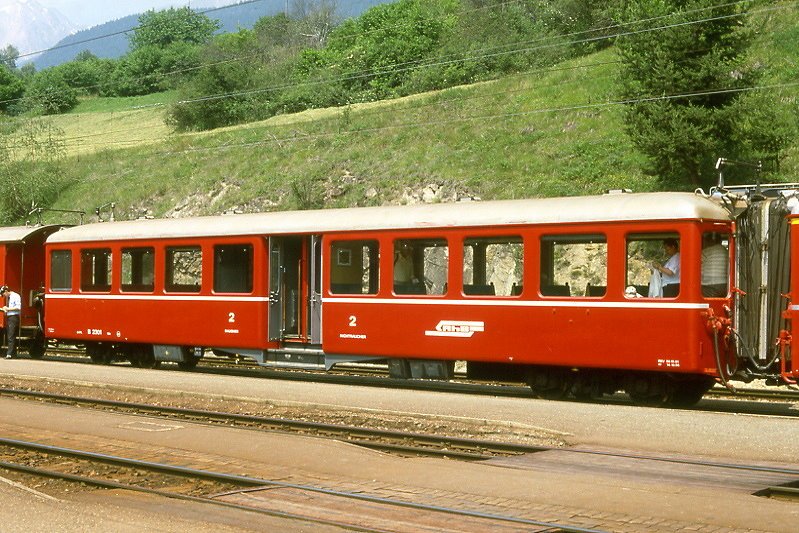 RhB - B 2301 am 26.06.1989 in Filisur - 2.Klasse Mitteleinstiegs-Personenwagen Fliegender Rhätier - Übernahme 1938 - SWS/SIG - Fahrzeuggewicht 18,00t - Sitzplätze 64 - LüP 17,73m - zulässige Geschwindigkeit 90 km/h - ®=30.10.1981 ®1=14.10.1986 - altes Logo RhB - Lebenslauf: ex C4ü 2301 - 1956 B4ü 2301 - 1964 B 2301