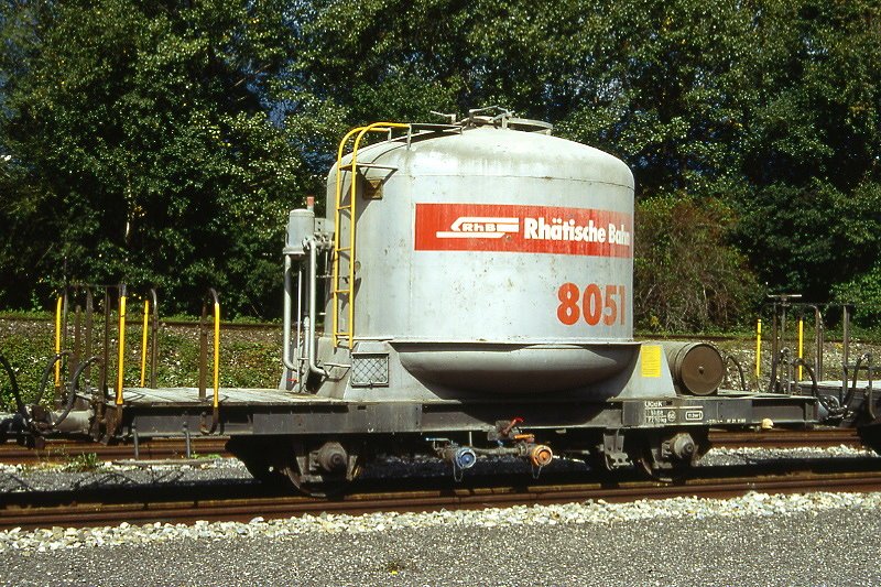 RhB - Ucek 8051 am 09.05.1991 in St.Moritz - Zementsilowagen 2-achsig mit 1 offenen Plattform - Baujahr 1955 - FC/MBA - Gewicht 7,64t - Zuladung 14,60t - LüP 7,75m - zulässige Geschwindigkeit 65 km/h - ®2=21.11.1990 - ohne RhB-Logo - Lebenslauf: ex OB1 8051 - 1969 Ucek 8051 - 2004 Uc 8051 - 11/2005 Abbruch.