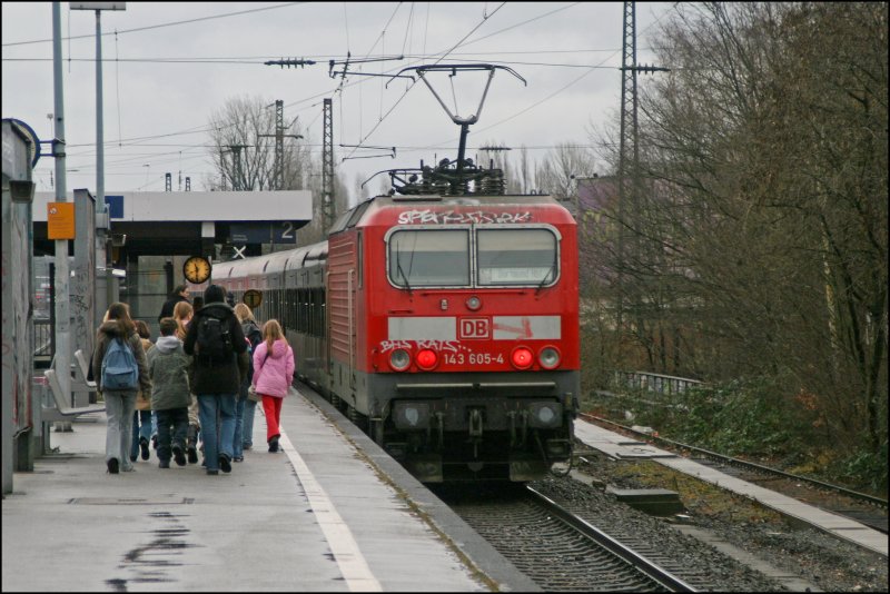 S-Bahnaltag Rhein/Ruhr: Während eine Familie (?) den Haltepunkt Bochum-Ehrenfeld Richtung Ausgang verlässt, verschwindet die 143 605 als S1, von Düsseldorf nach Dortmund, Richtung Bochum Hbf. (05.01.08)