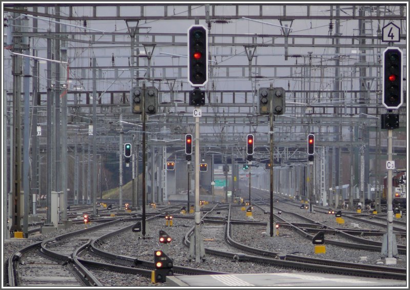 1116 099-1 mit EC 161 Maria Theresia nach Wien hat den Abfahrbefehl erhalten. Die Ausfahrgeschwindigkeit in Buchs SG durch die enge Linkskurve Richtung Rheinbrücke beträgt 50 km/h. (07.01.2008)