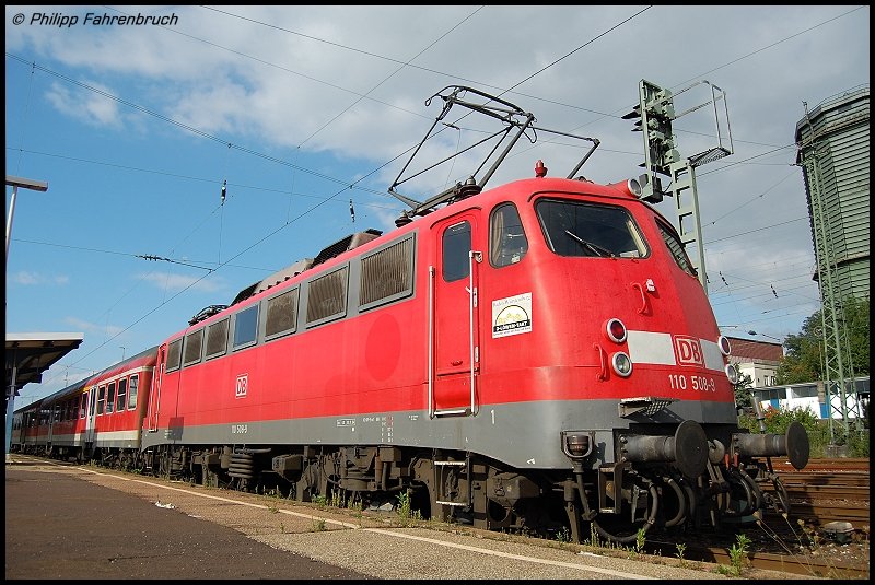 Weitwinkel mal anders... - 110 508-9 am 09.09.07 mit RB 37163 nach Donauwörth auf Gleis 5 des Aalener Bahnhofs.