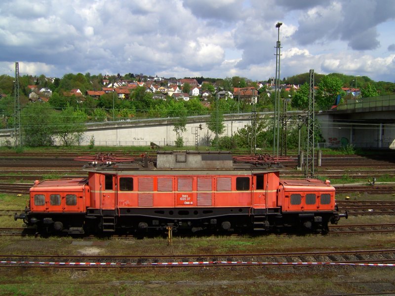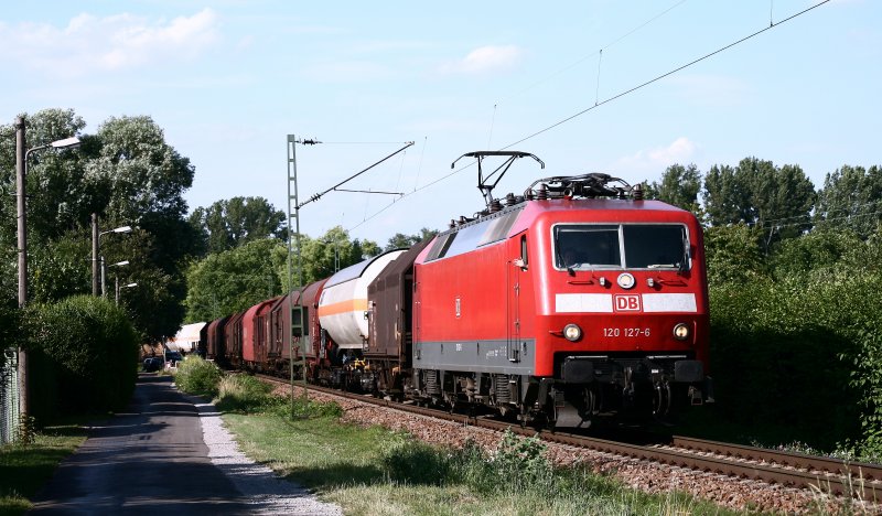 120 127 befördert am 10.07.08 den FIR 51341 von Gremberg nach Kornwestheim und rollt am frühen Abend gemächlich durch die Schrebergärten des Karlsruher Stadtteils Rintheim in den Güterbahnhof von Karlsruhe.
