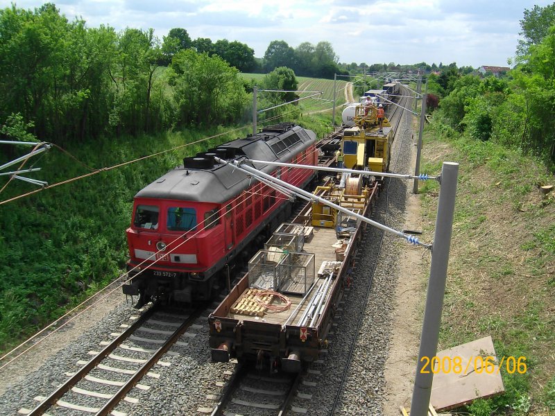 233 572-7 fährt mit DGS 43144 aus Verona an einem Oberleitungsrevisionsfahrzeug vorbei Richtung Lübeck Rbf. Reinfeld 6.06.08.