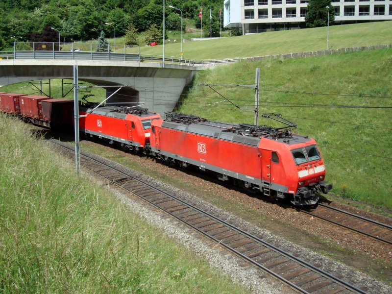 Der rote Zug mit zwei BR 185, diesmal aus der anderen Richtung bei Faido am 07.06.2008