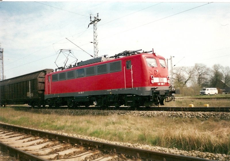 Die 140 380 hat aus dem Fährhafen Mukran kommend die Abzweigstelle Borchtitz erreicht.