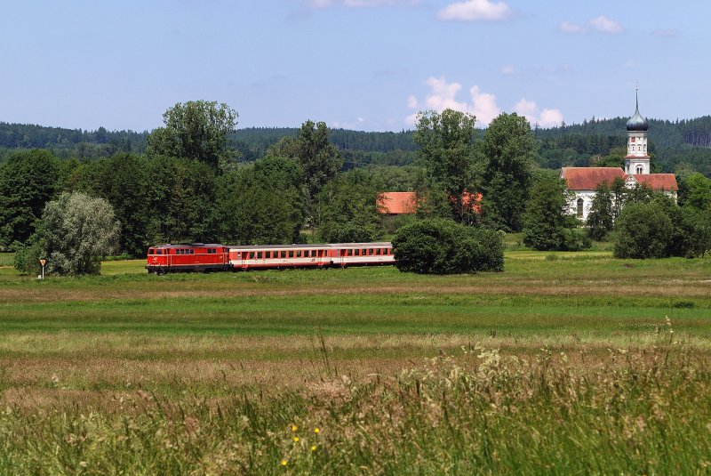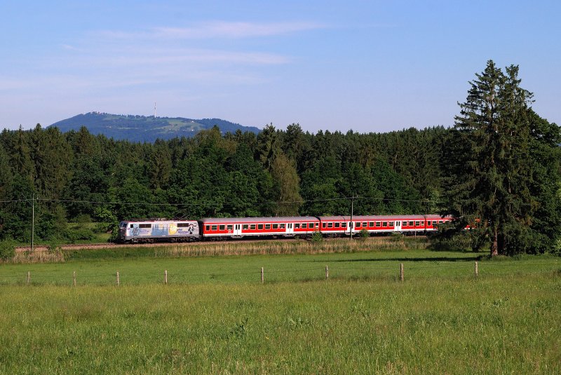 111 027 (850 Jahre München) mit RE 5411 vor Uffing (01.06.2008)