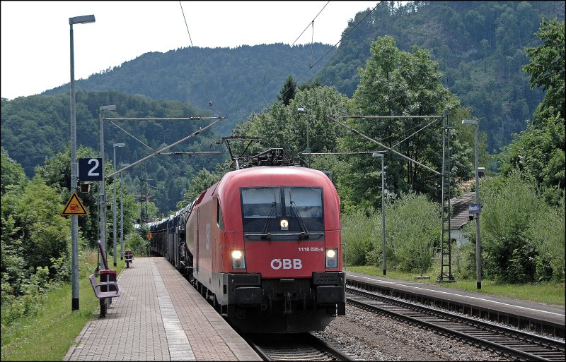 1116 035 bringt einen Güterzug aus Österreich Richtung München. Aufgenommen in Oberaudorf. (03.07.2008)