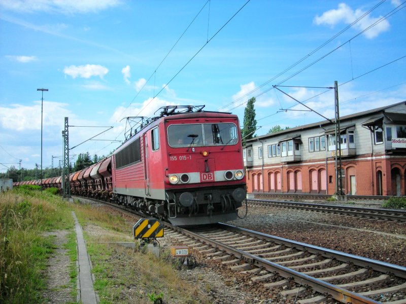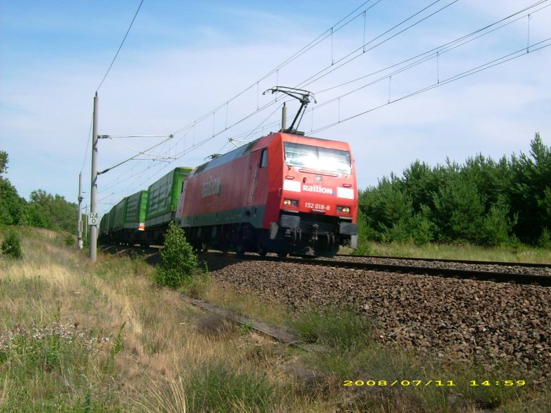 152 018 zieht am 11.07.08 den Hangartner-Zug von Berlin kommend durch Muldenstein.