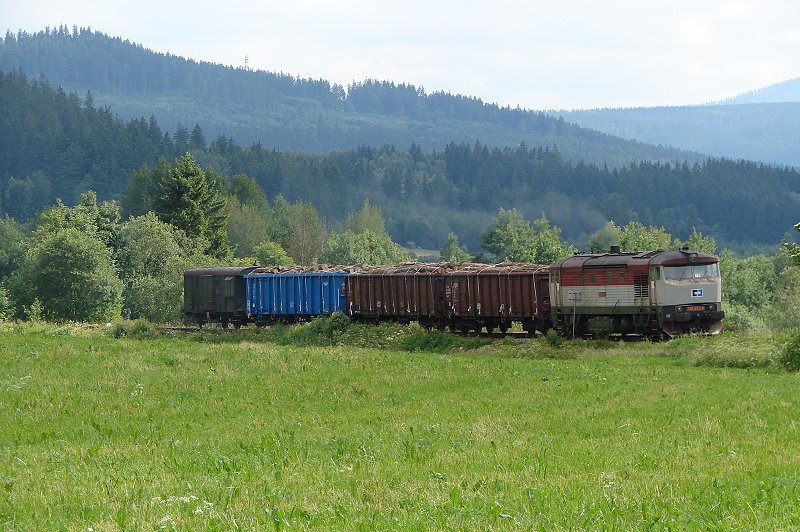 751 223 am 28.06.08 mit ihrem Güterzug zwischen Volary und Zbytiny