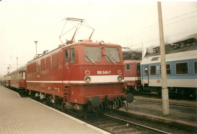 Die Stralsunder 109 049 zusammen mit dem Triebwagen 185 254 und 185 257 im Bahnhof Sassnitz nach dem Ende einer kleinen Lokausstellung im Sassnitzer Hafen im Mai 1997 auf dem Weg ins Heimatbw Stralsund.