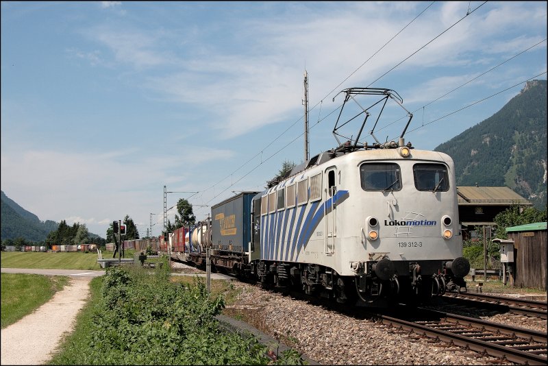 Ein Zebra unterwegs: Unweit von Oberaudorf bringt die 139 312 den DGS 43131(?) zum Brenner. (03.07.2008)
