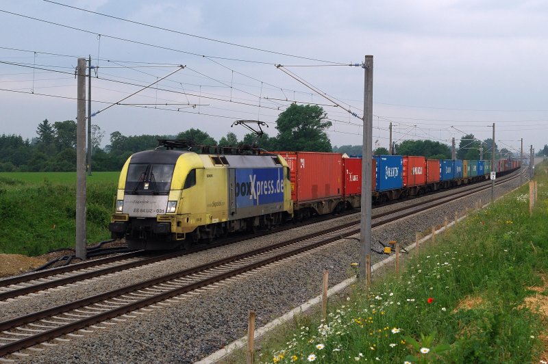 ES 64 U2 - 031 (boxXpress) mit einem Containerzug vor Haspelmoor (04.06.2008)