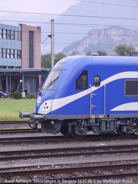 Frontansicht des Steuerwagens der Israel Railways, der zu Testzwecken in der Schweiz weilt.