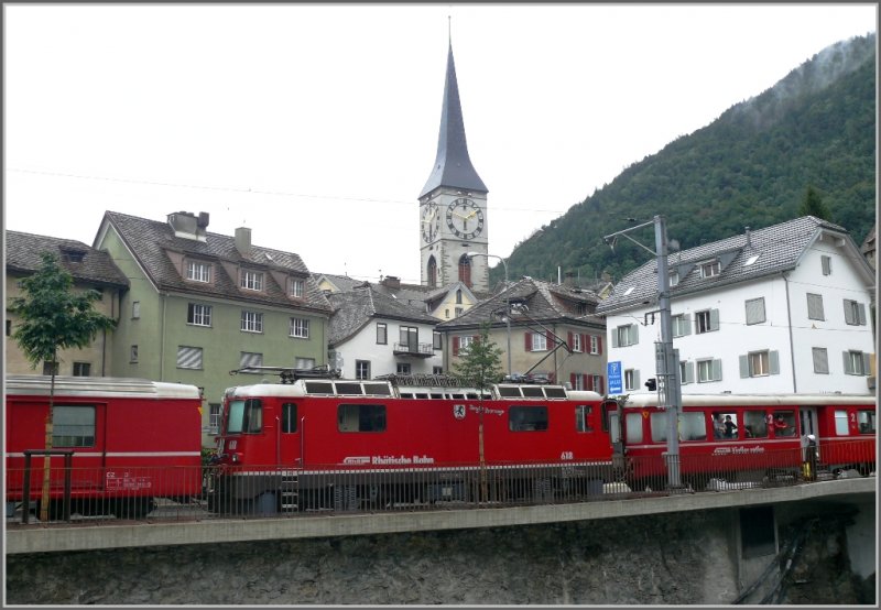 Ge 4/4 II 618 "Bergün/Bravuogn" hält vor der Martinskirche in Chur Stadt. (13.07.2008)