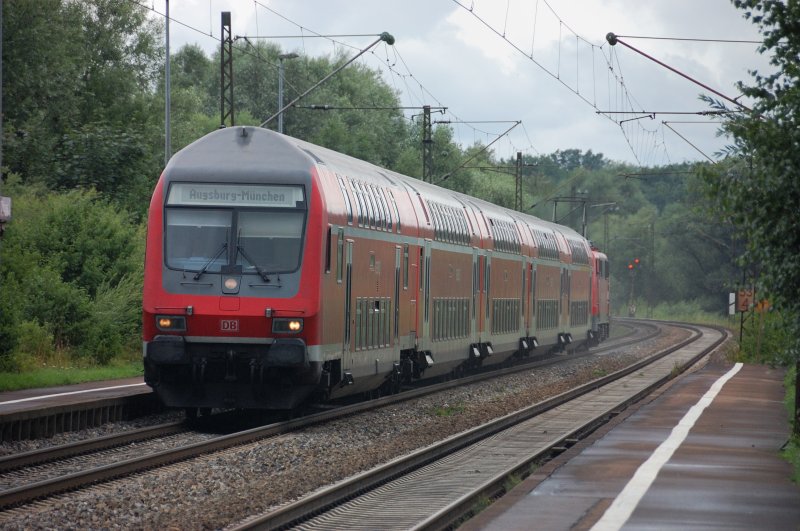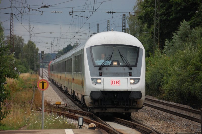 IC 2296, um 2 Wagen ergänzt, eilt Günzburg/Donau entgegen. Aufgenommen am 13.07.2008, kurz vor Offingen/Donau an der KBS 980.