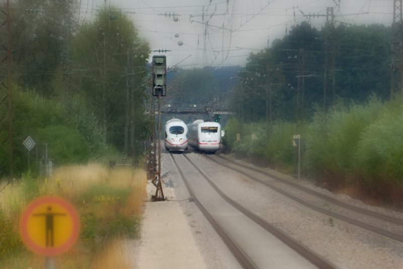 Parallelfahrt: Zwei ICE - Generationen begegnen sich zwischen Offingen/Donau und Mindelaltheim an der KBS 980. (13.07.2008).