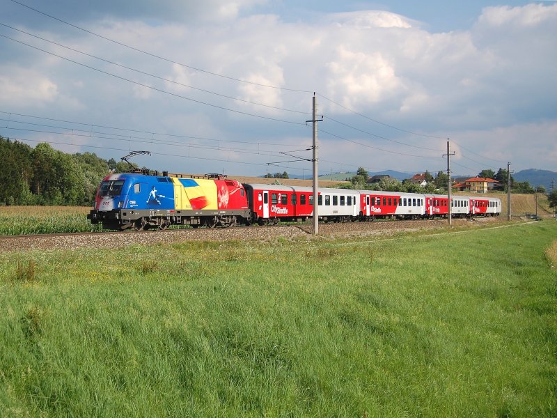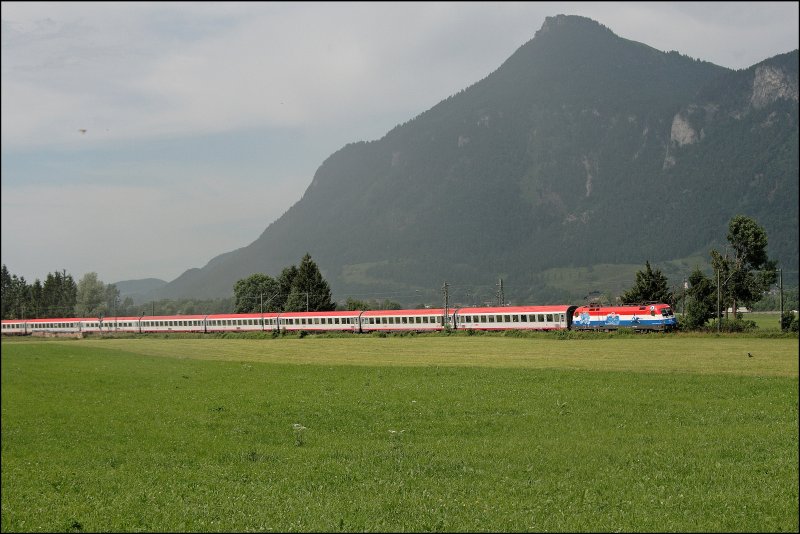 1116 108 "Kroatien" hat bei Oberaudorf den OEC 564, mit dem sehr schönen Namen "KUFSTEIN - DIE PERLE TIROLS", am Haken. Ziel ist Innsbruck Hbf. (03.07.2008)
