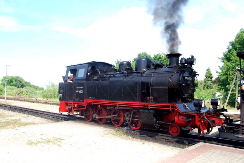 99 4801 fährt mit ihrem Personenzug aus dem Bahnhof Putbus aus, 06.07.08