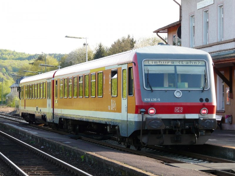 DB - Dieseltriebwagen 928 436-5 im Bahnhof von Stockhausen am 01.05.2008