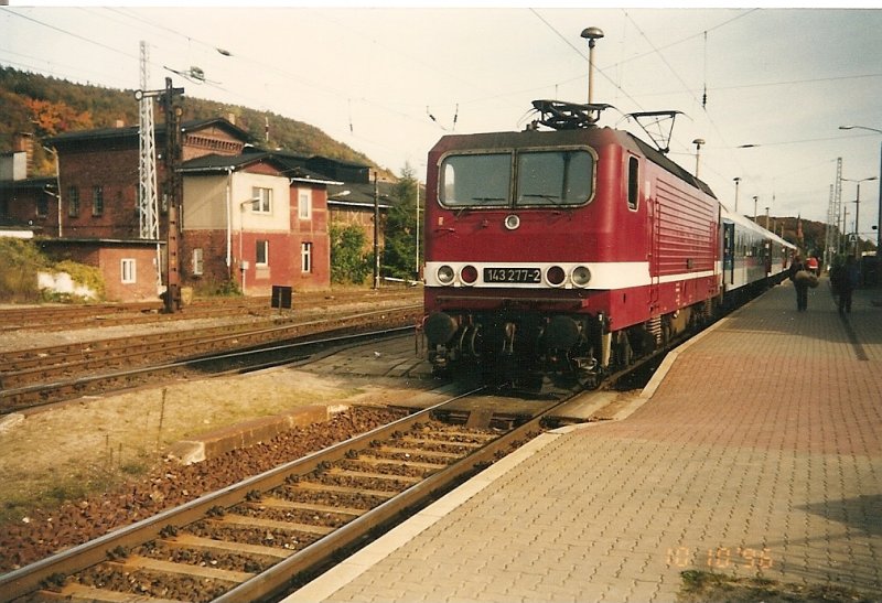 Der Interregio Sassnitz-Berlin mit der 143 277 am 10.10.1996 in Sassnitz.Am Zugschluß laufen die Kurswagen aus Malmö mit.