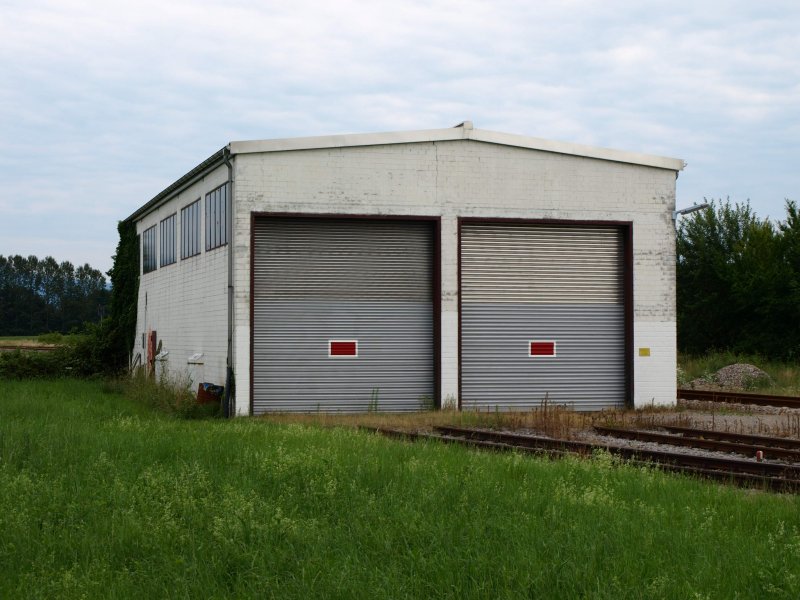 Der Lokschuppen der V100 der SWEG in Schwarzach. Der Lokschuppen befindet sich in Mitten des Gleisdreiecks Schwarzach. Man kann die drei Gleise ansatzweise im Hintergrund erkennen. Hinter dem rechten Tor parkt die V100. Fotografiert am 14. Juni 2008.