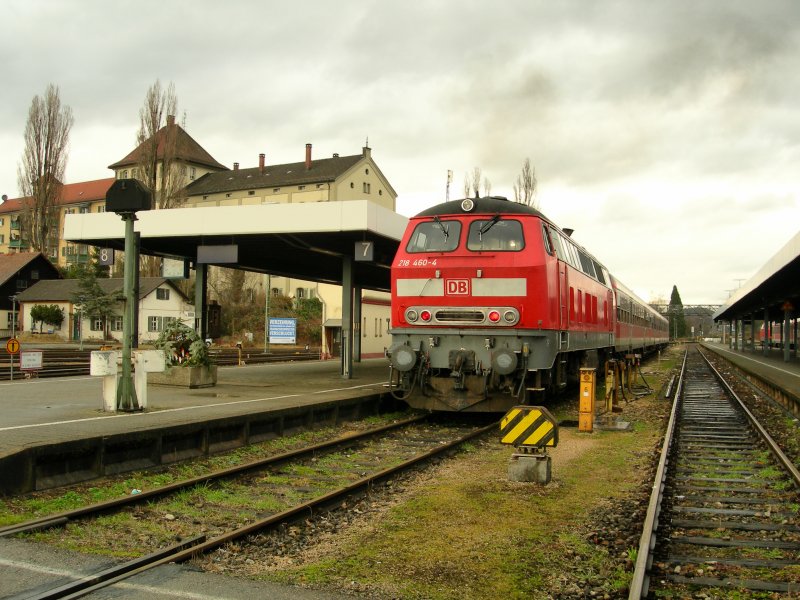 Die 218 460-4 steht in Lindau Hbf mit einem RE abfahrtbereit auf Gleis 7. Der sichere Zugang der Reisenden zum Zug wird durch Sperrsignale gesichert.