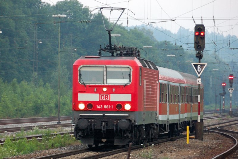 Die ersten Gehversuche auf neuem Terrain. Ab Fahrplanwechsel 2008/2009 im Dezember sollen Loks der Baureihe 143 sämtliche Leistungen der 111er zwischen Donauwörth und Ulm übernehmen. Hier 143 961-1 mit illustrem Kurzzug kurz nach 6 am Morgen in Neuoffingen, 15.07.2008 .