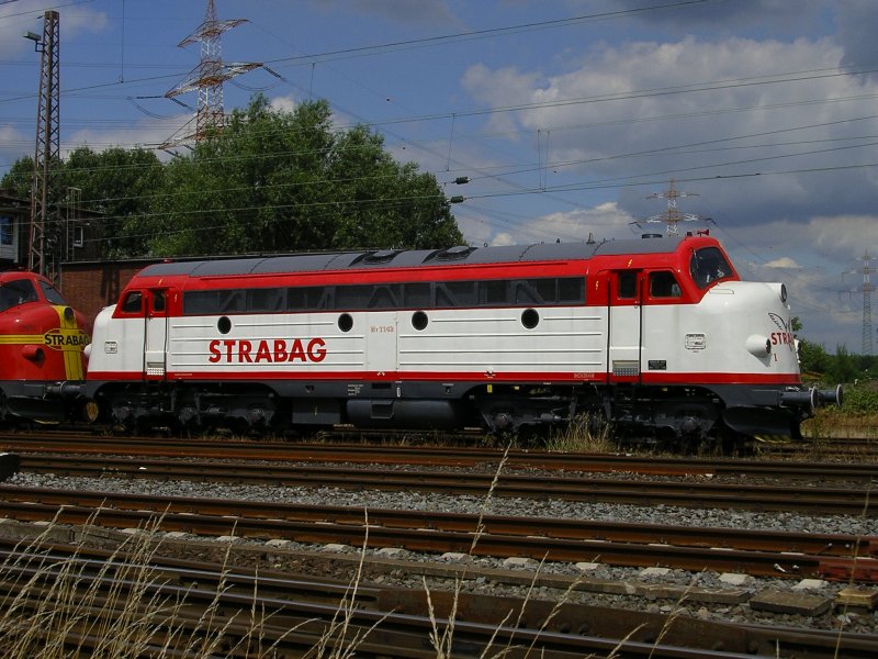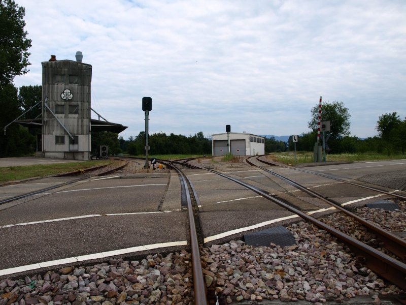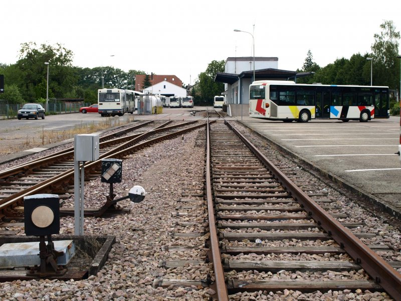 Hinten der Busbahnhof der SWEG in Schwarzach. Auf dem linken Gleis kommt die Lok aus dem Lokschuppen. Danach muss die vordere Weiche umgestellt werden, damit die Fahrt in die Gegenrichtung weitergehen kann. Das rechte Gleis ist ein stillgelegtes Gleis und ein Teil vom Gleisdreieck. Ganz ganz früher führte dieses Gleis über Lichtenau, Scherzheim an der B36 entlang bis nach Kehl. Damals lief alles noch in Schmalspur und unter dem Namen MEG. Heute verschwindet das Gleis im Teer etwa 200 m weiter. Hinten links: Die Tankstelle für die V100. Fotografiert am 14. Juni 2008.