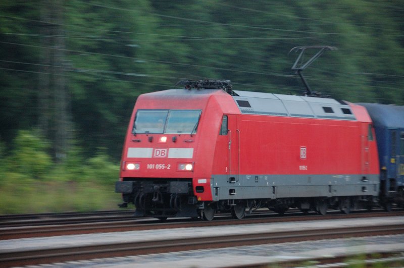 Manch einer wird morgens die Welt genauso verschwommen wahrnehmen, wie hier in der gewollten Unschärfe von 101 055-2. Und dann gleich Vollgas in den Tag. (Neuoffingen, 15.07.2008)