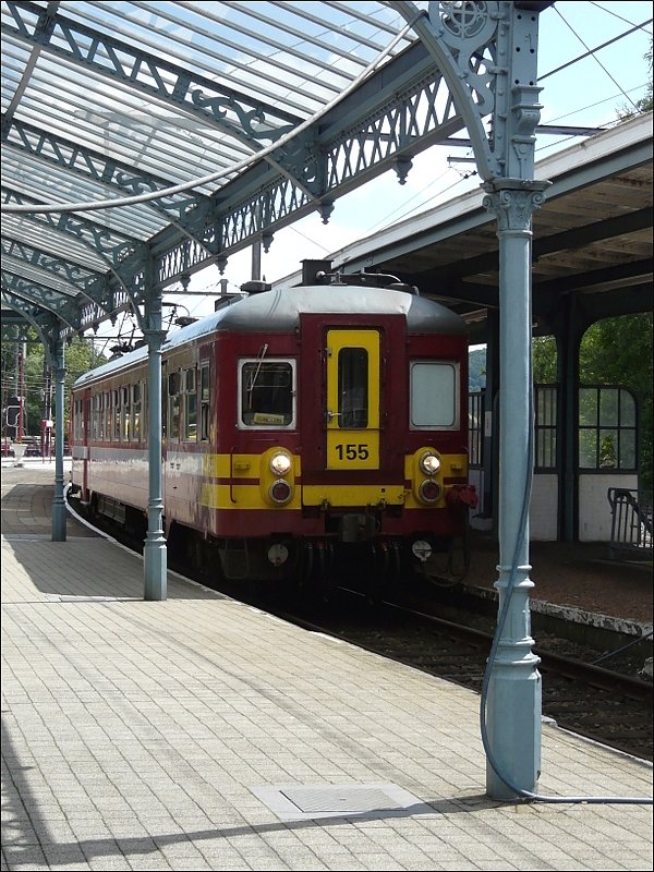 Triebzug 155 kommt am 12.07.08 aus Verviers und fährt unter der schön restaurierten Marquise in den Bahnhof von Pepinster ein, um nach kurzem Halt seine Reise nach Spa-Géronstère fortzusetzen. (Jeanny)