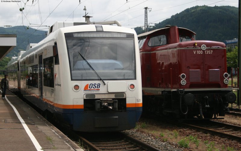 VT520 und *** als OSB87339 neben V100 1357 und ihrem Sdz in Hausach 13.7.08