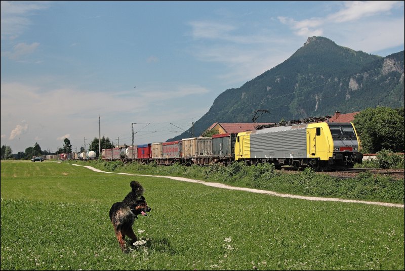 Während die E189 912RT (9480 6 189 912-9) einen KLV-Zug Richtung Kufstein brachte, rannte mir dieser Hund ins Bild;-)