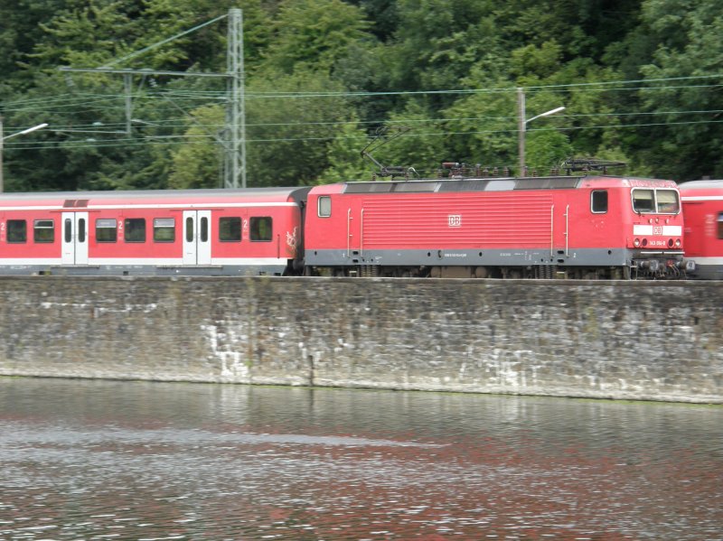 BR 143 014-9 zieht eine S-Bahn in Richtung Hattingen Mitte an der Ruhr bei Bochum Dahlhausen entlang. (09.07.2008)