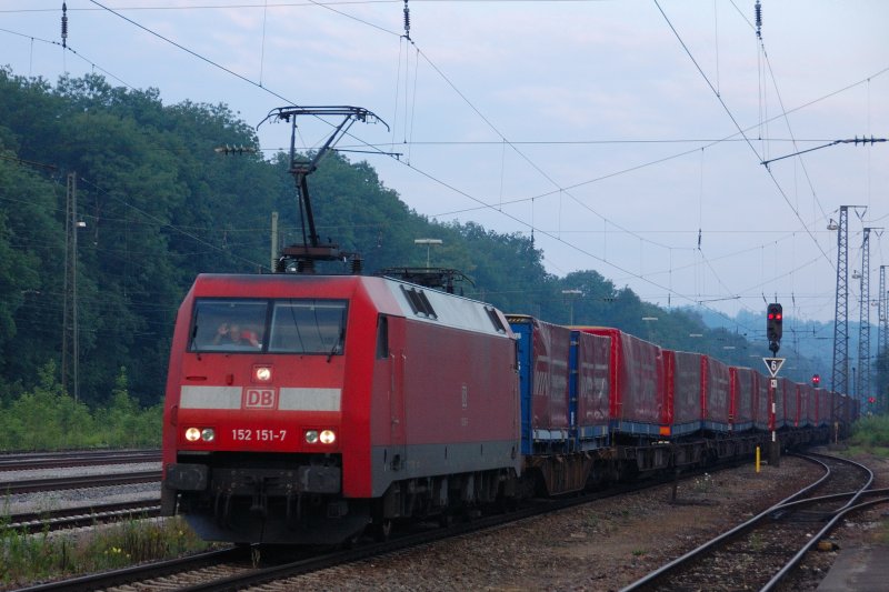 Zwangsumleitung für den "Winner": Heute muß 152 151-7 (Peter, achte mal auf DIESE Nummer, grins) mit ihrem Trailerzug über Donauwörth fahren, da zwischen Burgau und Dinkelscherben (KBS 980) Gleiserneuerung ansteht. Daher nur eingleisig. Gruß an den freundlichen Tf. (15.07.2008)