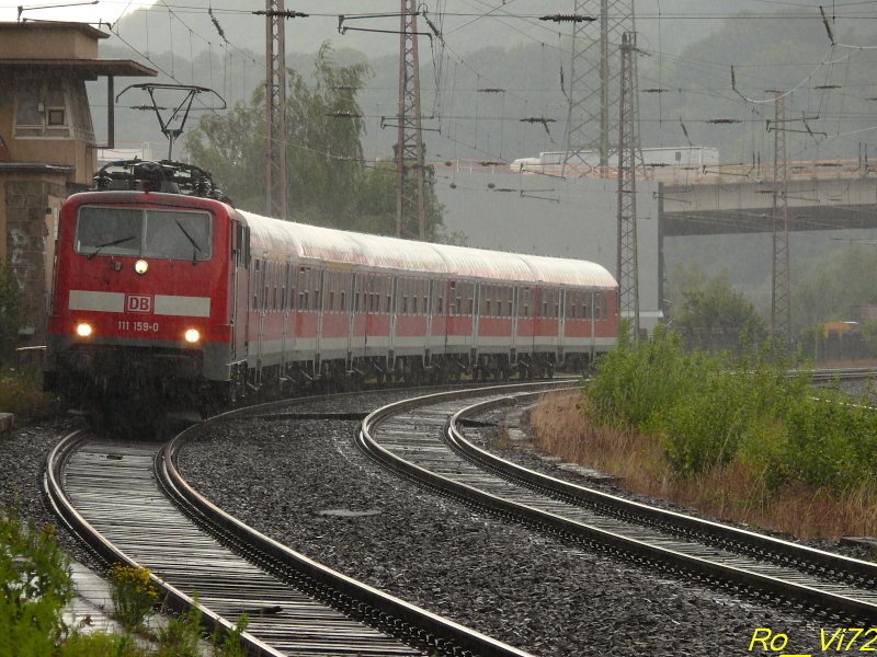 111 159-0 mit RE 13 Maas-Wupper-Express (Venlo-Hamm) durchfährt im strömendem Regen d. ehem. Bf Schwerte-Westhofen. 18.07.2008.