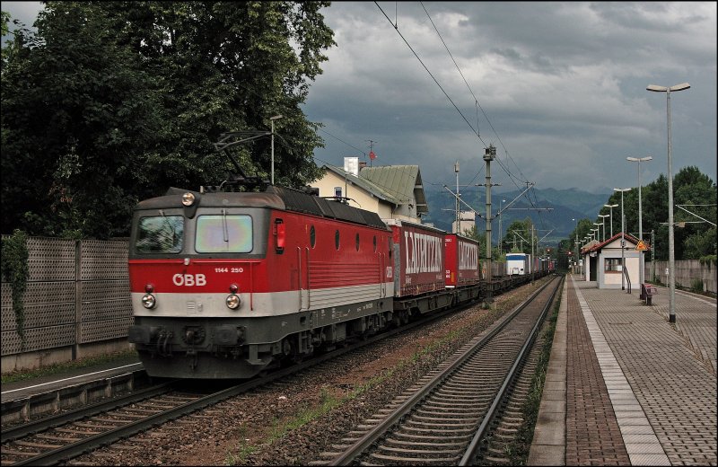 1144 250 hat den TEC 40575 "LAURITZEN", von Taulov(DK) nach Verona Q. E. durchfährt, auf der über 1000 Km langen Fahrt, den Bahnhof Kiefersfelden. (03.07.2008)