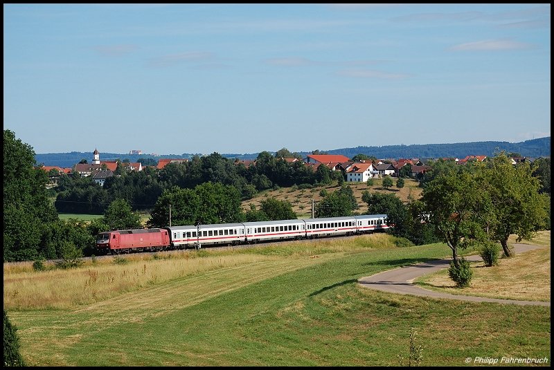 120 139 zieht am Abend des 05.07.08 IC 2161 von Karlsruhe Hbf nach Nürnberg Hbf, aufgenommen am Km 5,8 der Oberen Jagsttalbahn (KBS 786) bei Saverwang. Am Zugschluss schob 101 098 mit.