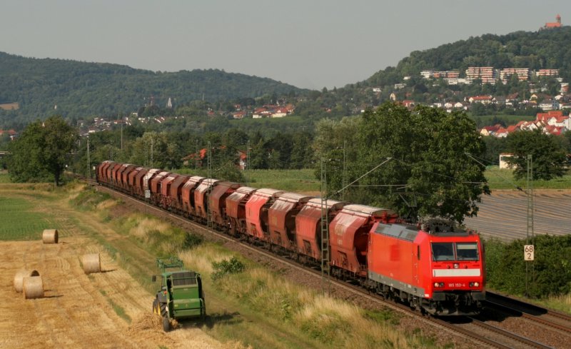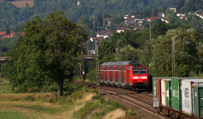 Zugkreuz ähhhh Zugbegegnung. Der Güterzug einer 155 und 146 120. 15. Juli 08, Großsachsen-Heddesheim.